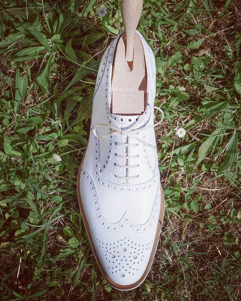 Introducing our Designer Men's White Color Wing Tip Brogue Lace Up Leather Dress Formal Shoe, the epitome of sophistication and style. Crafted with the finest quality materials, this shoe is a must-have for any gentleman looking to make a lasting impression.Key Features:1. Premium Leather Material: Made with genuine leather, this shoe offers durability and a luxurious feel. The upper is crafted from genuine leather, ensuring a sleek and polished look.2. Classic Wing Tip Design: The wing tip brogue detailing adds a touch of elegance and sophistication to this dress shoe. It exudes timeless style and showcases your impeccable taste.3. Soft Calf Leather Lining: The soft calf leather lining provides ultimate comfort and breathability, allowing you to wear these shoes for extended periods without discomfort.4. Genuine Leather Sole and Heel: The genuine leather sole and heel not only enhance the overall durability of the shoe but also provide excellent traction and stability. They ensure a confident stride on any surface.5. Lace-Up Closure: The lace-up design allows for a secure and customizable fit. It adds a touch of formality to the shoe, making it suitable for various formal occasions.6. Hand Stitched Detailing: All our shoes are meticulously hand-stitched by skilled artisans, ensuring superior craftsmanship and attention to detail. This adds to the overall quality and longevity of the shoe.7. Versatile and Timeless: This dress shoe is a versatile addition to your wardrobe, effortlessly complementing a range of outfits. Whether it's a formal business meeting or a black-tie event, this shoe will elevate your style.Please note that accessories may differ slightly from the original picture due to availability. However, rest assured that the quality and design of the shoe will not be compromised.Invest in our Designer Men's White Color Wing Tip Brogue Lace Up Leather Dress Formal Shoe and step into a world of elegance and sophistication. If you have any questions or need further assistance, please feel free to send us a message at any time.