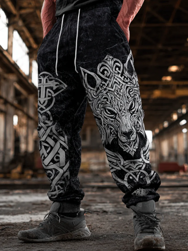 Men's Black And White Gradient Wolf Head Design Sweatpants