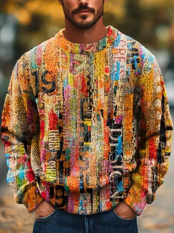 Men's Colorful Abstract Art Print Knitted Crew Neck Sweater