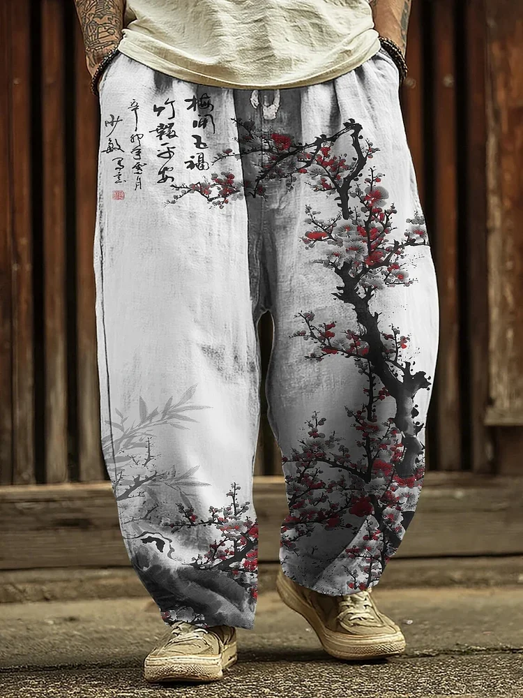 Men's Japanese Art Plum Blossom Print Casual Pocket Pants
