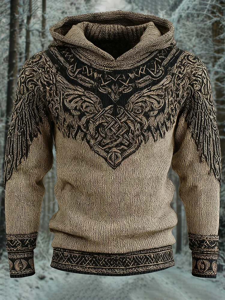 Men's Retro Viking Wings Celtic Knot Print Knit Hooded Sweater