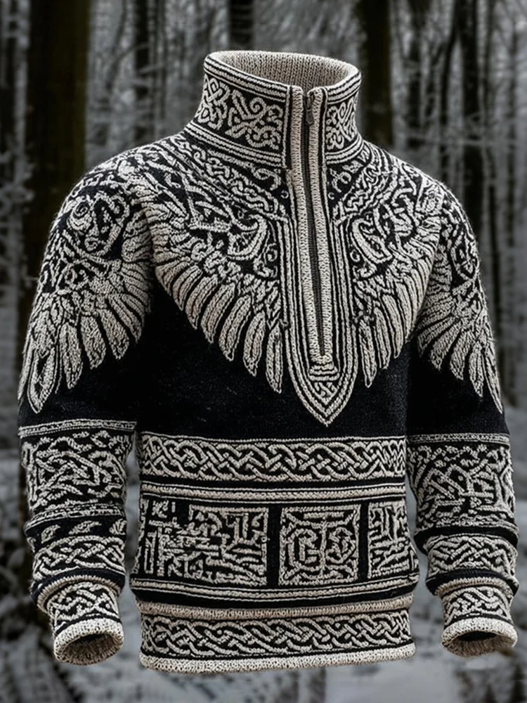 Men's Viking Celtic With Wings Art Cozy Knit Half Zipped Sweater
