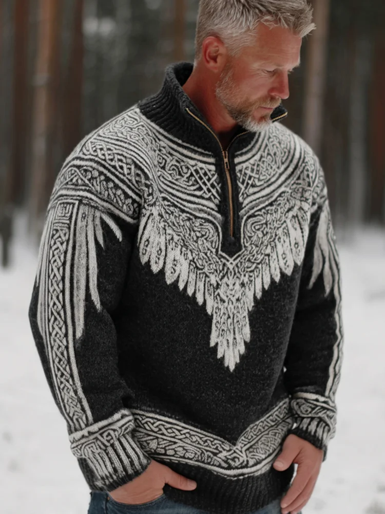 Men's Viking Celtic With Wings Art Cozy Knit Half Zipped Sweater