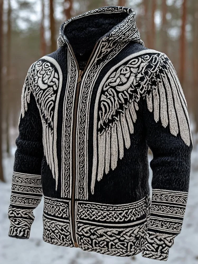 Men's Viking Celtic With Wings Art Cozy Knit Zipped Hooded Sweater