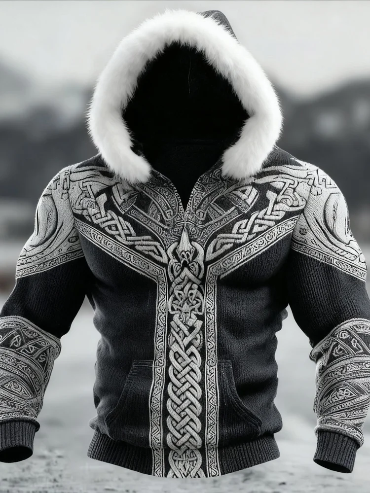 Men's Viking Inspired Celtic Fur Trim Cozy Knit Hooded Sweater