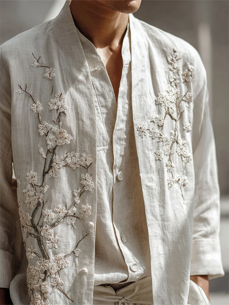 Men's White Almond Blossom Embroidered Linen Kimono Cardigan