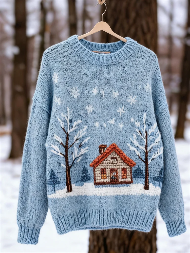 Vintage Snowing Forest Cottage Crochet Cozy Knit Sweater